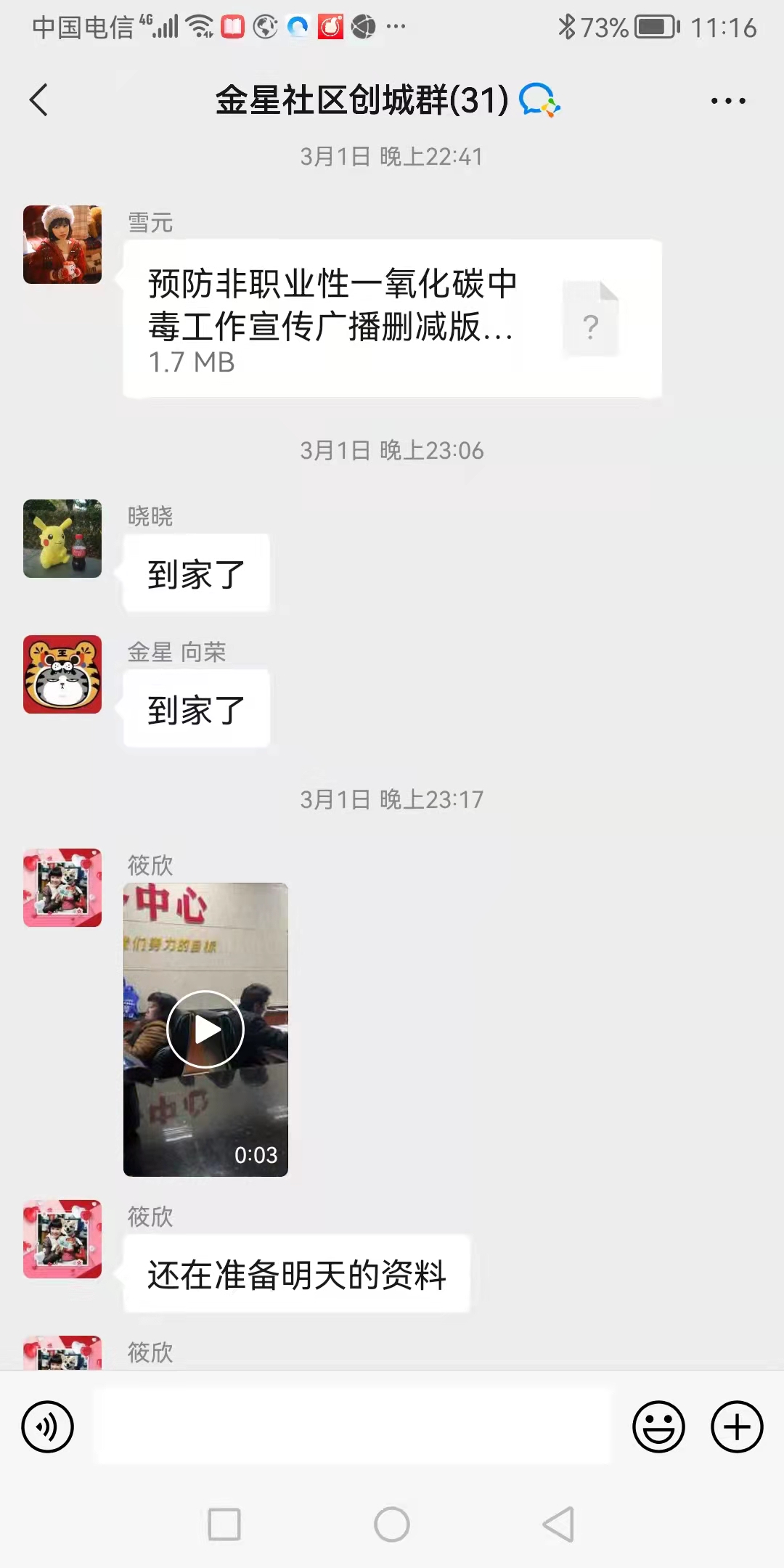 3月1日晚,23:17分,为了宣传让居民防范一氧化碳中毒,她们仍在准备明天的资料……