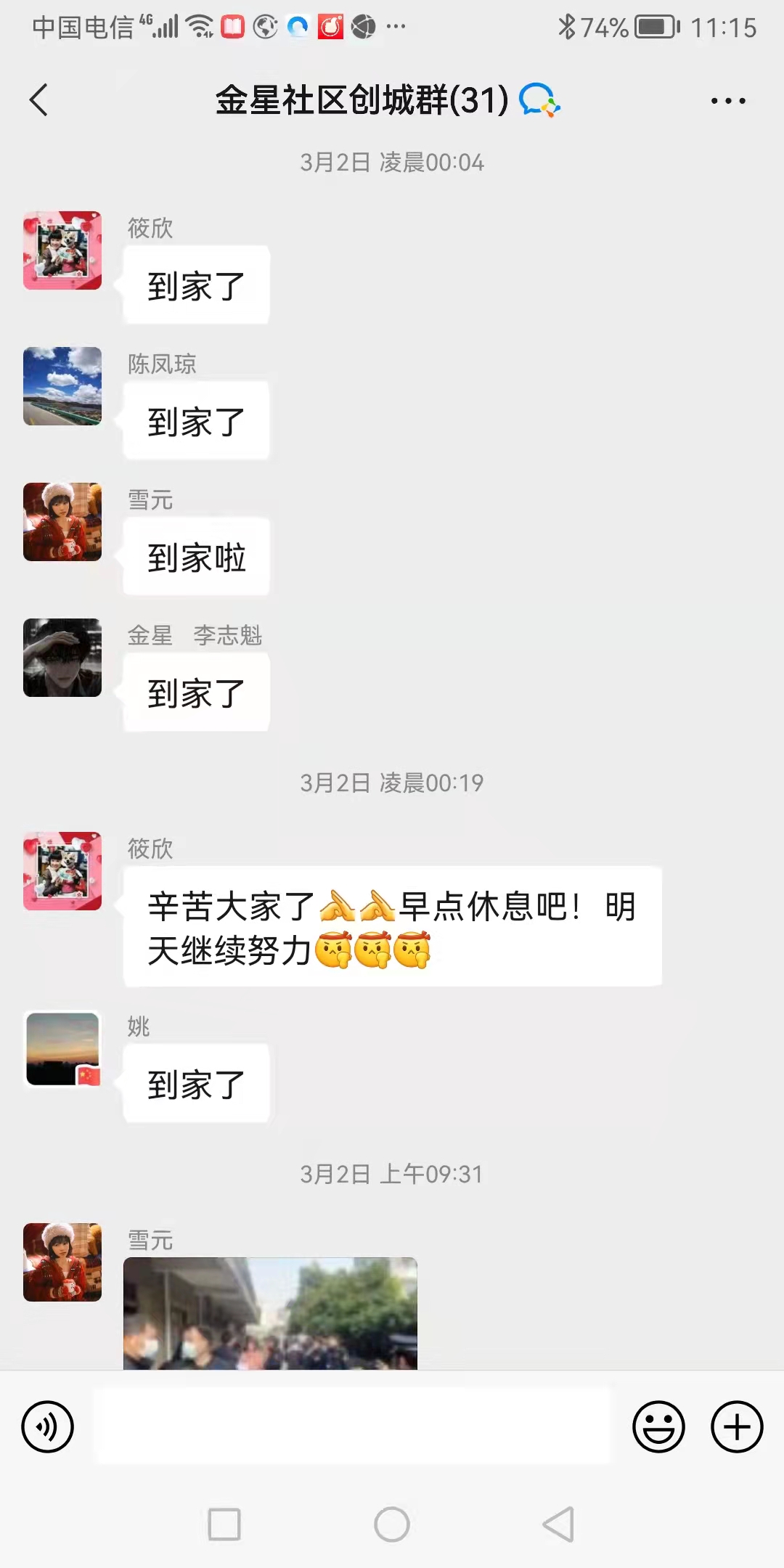 3月2日凌晨00:04分,大家纷纷回复“到家了”,社区书记秦秋英时刻担心工作队员的安全……