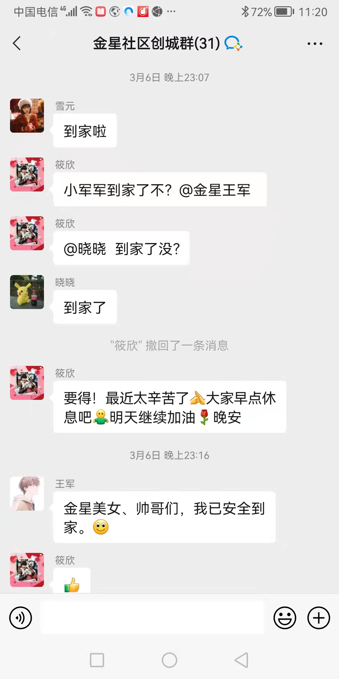 3月6日,周日晚上23:07分,同样是有人回复“到家了”,还有人关切的等待“到家了没?”